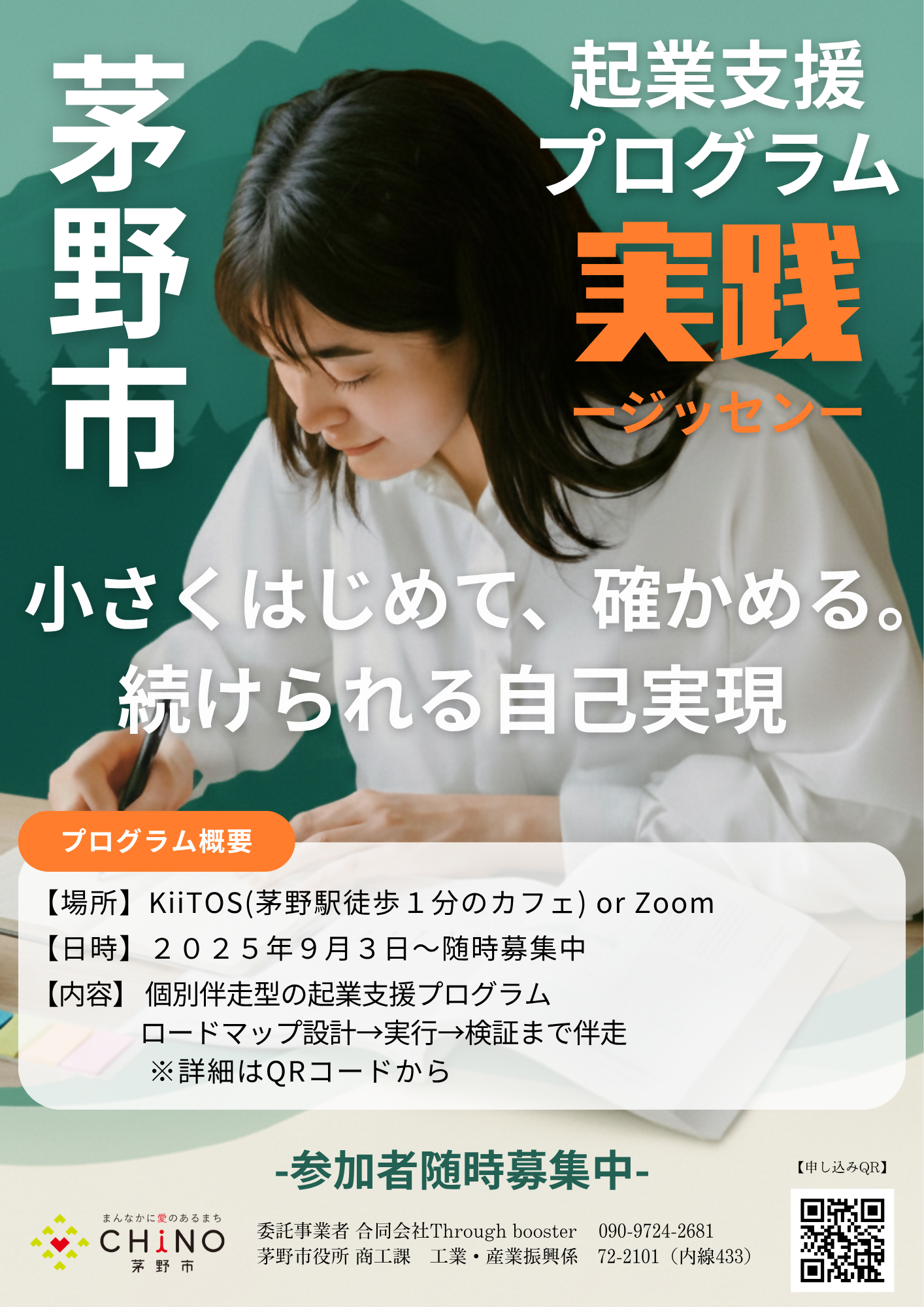 女性が活躍し躍動できるまち「茅野」を確立していくため、今年度、女性や若者の挑戦を後押しする起業支援プログラムを実施します。参加者一人ひとりに寄り添った個別面談(全5回)と、学びと交流を深めるセミナー(全3回)を組み合わせ、地域での起業や移住後のチャレンジを具体的に支援します。